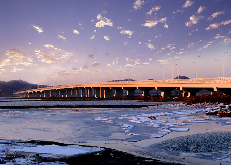 大橋工程分為主橋、預制段引橋和北側現(xiàn)澆段引橋,其中主橋長500米,主跨為120米的大跨變截面預應力混凝土連續(xù)箱梁,是當時東北地區(qū)跨度最大的連續(xù)梁跨海橋。大橋的設計結合了使用和景觀的雙重功能,作為普灣經(jīng)濟區(qū)核心位置的地標性景觀,獨具特色的夜景設計使其成為經(jīng)濟區(qū)一道亮麗的風景線。